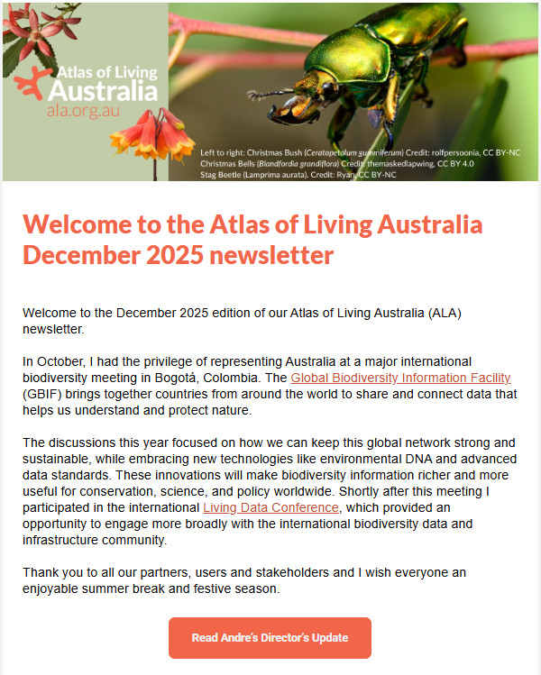 Posted on 16th December 2025 The ALA December 2025 newsletter is out now – featuring our Year in Review, new Australian Biodiversity Data Mobilisation Program projects, and new taxonomic backbone release! Discover the ALA’s December 2025 newsletter.